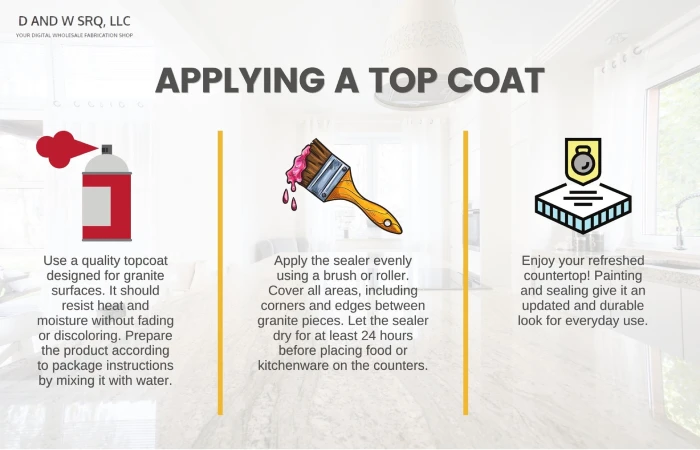 Once you have finished painting the granite countertop, it is time to apply a top coat. This will help protect the paint job and ensure your new look lasts for years. Applying a top coat to granite countertops can be done in just a few easy steps.