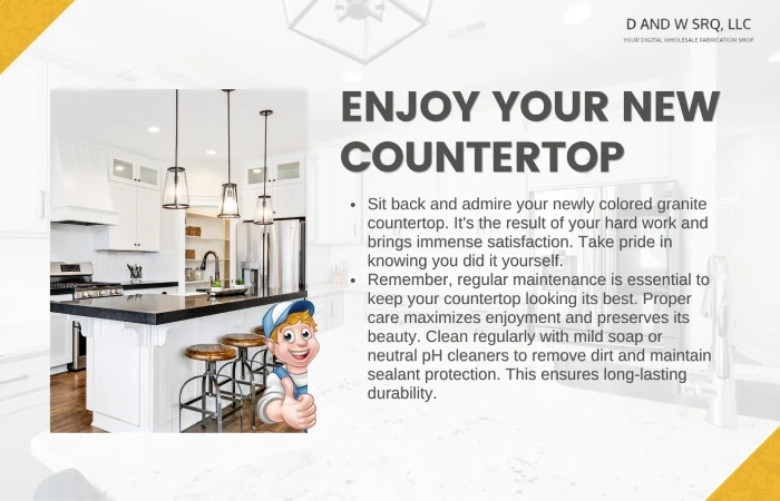 Now that you’ve changed the color of your granite countertop, it’s time to sit back and enjoy the fruits of your labor. This can be an incredibly rewarding experience that brings a sense of satisfaction from seeing the results of hard work. In addition, you’ll get to admire how beautiful your new countertop looks and take pride in knowing this was all done by yourself.