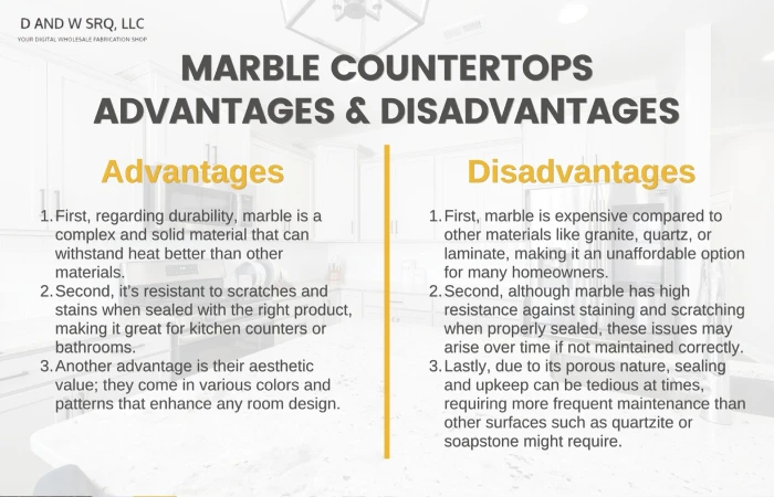 Marble countertops offer several advantages. First, regarding durability, marble is a hard and solid material that can withstand heat better than other materials. In addition, it’s resistant to scratches and stains when sealed with the right product, making it great for kitchen counters or bathrooms. Another advantage is their aesthetic value; they come in various colors and patterns that enhance any room design.