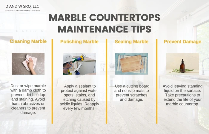 - Sealing Marble: To protect against scratches, use a cutting board when preparing food on top of your marble countertop. It’s also recommended to place nonslip mats under any heavy items, such as pots and pans, to prevent further damage.